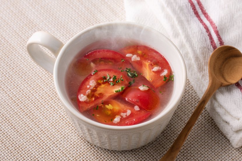 切ったトマトと熱湯ですぐできる洋風スープです。