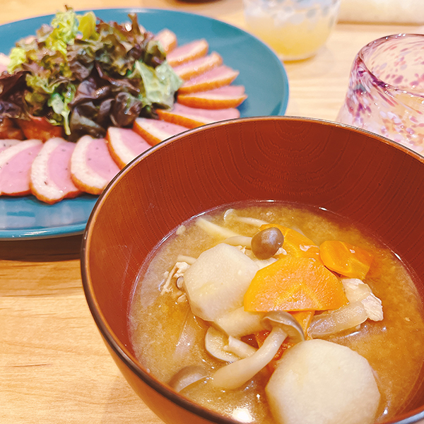たっぷりの具材が入ったサラダのようなボリューム満点みそ汁。