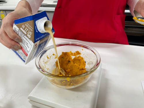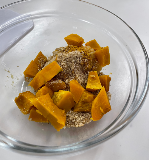 カレー粉、すりごま、かぼちゃを混ぜ合わせます。