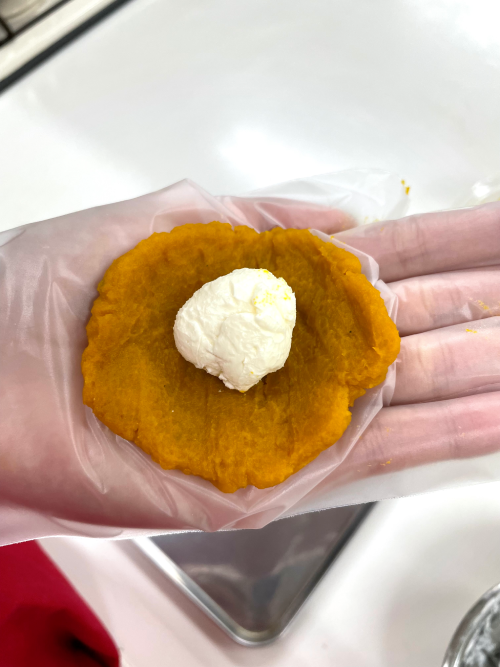 直径10㎝の丸形に抜いたらかぼちゃチーズあんに大福生地を被せて