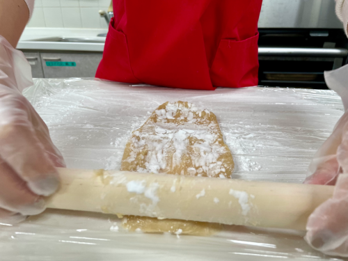 片栗粉を広げた上に生地をのせ、めん棒で厚さ2~3mmになるまで薄くのばします。