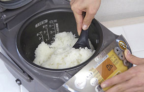 5.ごはんが炊けたら、底の方からご飯を持ち上げて固まりをほぐし、余分な水分をとばすとおいしく仕上がります。