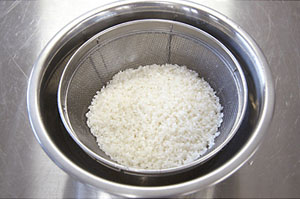 1.お米を用意します。この時、ザルを用意しておくと、お米を洗う作業を手早く効率的に行うことができます。