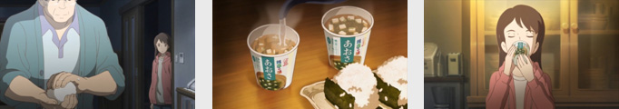 ある夜、おなかをすかせた娘が階下に降りていくと食卓におにぎりとカップみそ汁が用意されていました。翌朝、「夕べ夜食ありがとう」と母に伝える娘。しかし、何も知らない様子の母に「あれはお父さんが?」と思った娘は確認するため、その夜も階下に降ります。そこにはやはり父の姿が。おにぎりを作りながら「父さん、なんだか腹が減っちゃってな。お前も食うか」と言う父。娘は小さな声で「うん」と答えます。父のやさしさとあたたかさがこもった不格好なおにぎりとカップみそ汁を前に、じゃんけんをしてどちらのおにぎりを食べるか決めようと父に言われ、娘の声と表情が和らぎます。