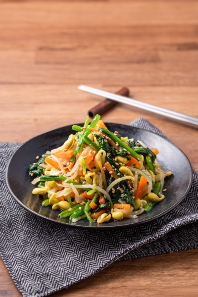 もやしがなかったので、塩もみした大根と、茹でたにんじん、ほうれん草を使いました。いつも作るもやしのナムルは、塩と醤油、ごま油、ガラスープなどで調味しますが、生塩糀とごま油なのできれいな色に仕上がり、砂糖を少し入れると味に深みが増し、おいしくできました。パッケージにお肉があしらわれているので、ナムルなどの野菜だけのあえ物に使うことは思いもよりませんでした。これをきっかけに、応用範囲が広がりそうです。