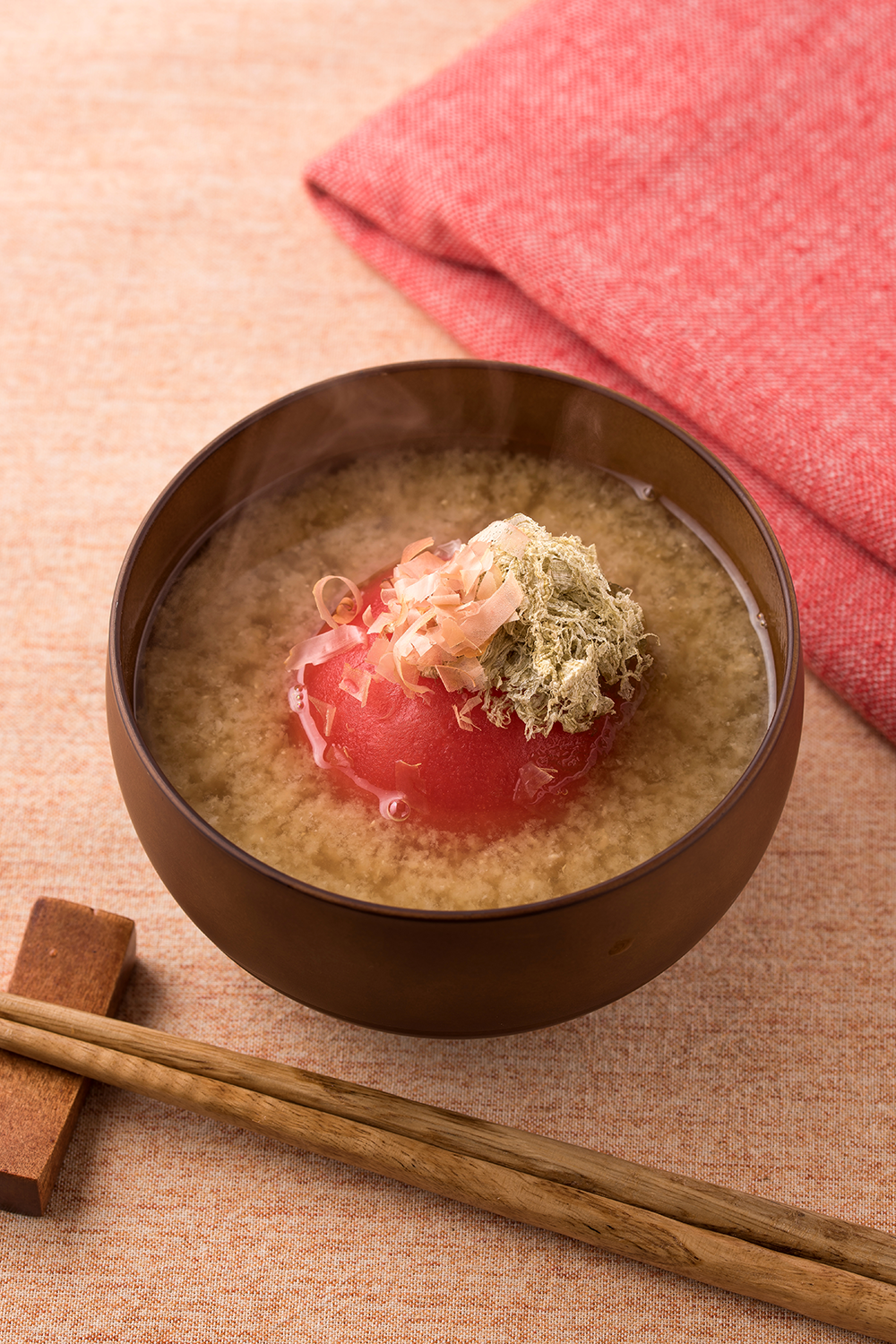 トマトの存在感があり お味噌汁とマッチして美味しくいただけますね。スープ皿でいただいています。
