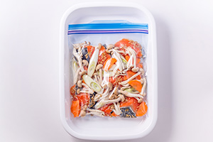 フリーザーバッグに②の生鮭を入れ、生鮭の上に③の野菜をまんべんなく散らし入れ、空気を抜いて冷凍する。