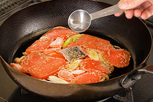 生鮭は塩(分量外)を振って10分置き、キッチンペーパーで水分をふきとる。