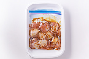 フライパンにサラダ油をひき、④の鶏もも肉を皮を下にして焼く。