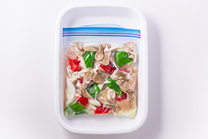 ②の鶏むね肉の上に③の野菜をまんべんなく散らし入れ、空気を抜いて冷凍する。