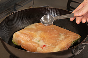 フライパンにサラダ油をひき、凍ったままの④を野菜面を下にして入れ、水大さじ2(分量外)を振りかけてフタをし、4分蒸し焼きにする。