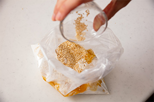 清潔なビニール袋に小麦粉と三温糖を入れ混ぜる。