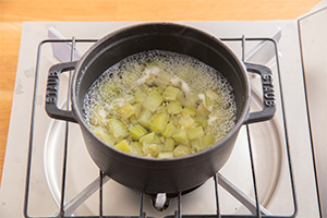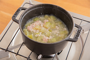 鶏挽き肉に少量の水(分量外)を加え、バラバラになったら水ごと①に入れて煮込む(アクが出たらすくい取る)。